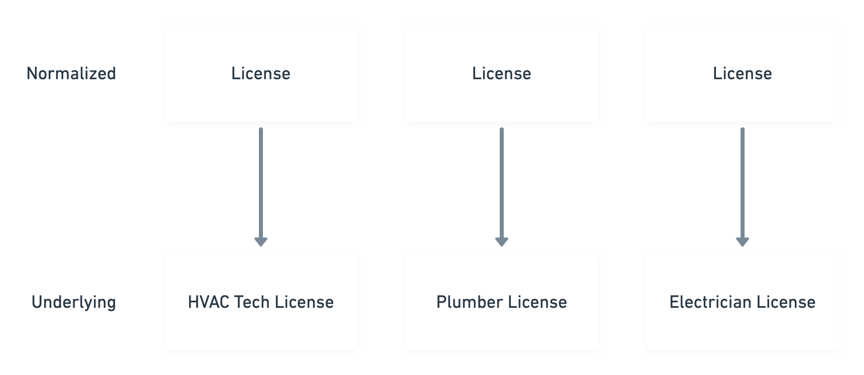 We need all of this data combined into a single "licenses" table so that users can search across all licenses at once. Many of our clients employ both plumbers and electricians, or electricians and HVAC technicians. The fact that these licenses come from totally different data sources is an interesting implementation detail, but the users don't care about that, they just want to see:
