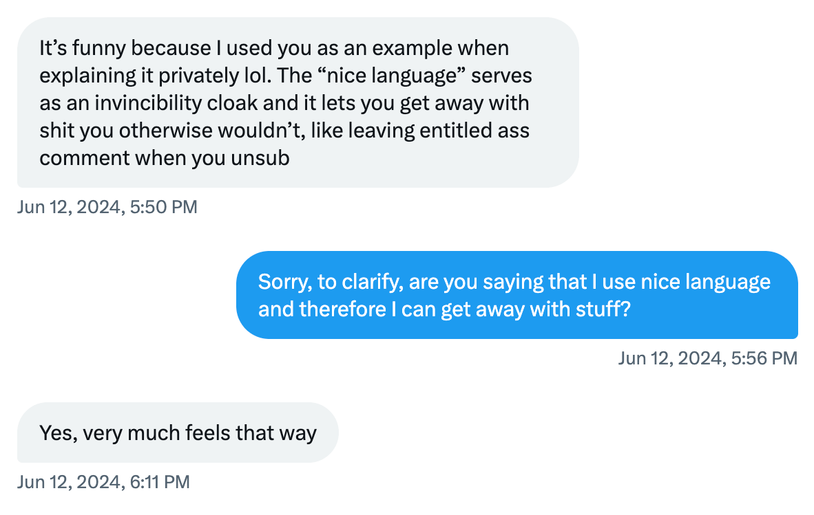 I've been praised for being nice, but I've also been accused of being nice so that I can be mean and get away with it: